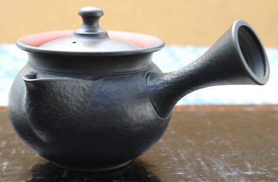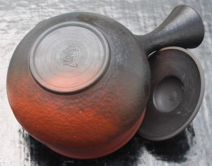 深みのある漆黒の窯変が魅力です。又銅板をたたいてできたような凹凸が味わい深いものがあります。朱泥と窯変の対比が見事な急須の逸品です。