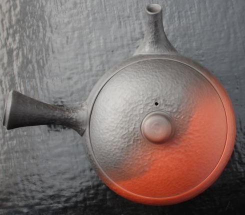 穏やかな丸みを帯びたフォルム。朱泥と窯変のバランスもいい感じです。籾殻の中に埋め朱泥を漆黒に窯変させ、ガラス棒で叩いて凹凸を施し何とも言えない味を造っています。.